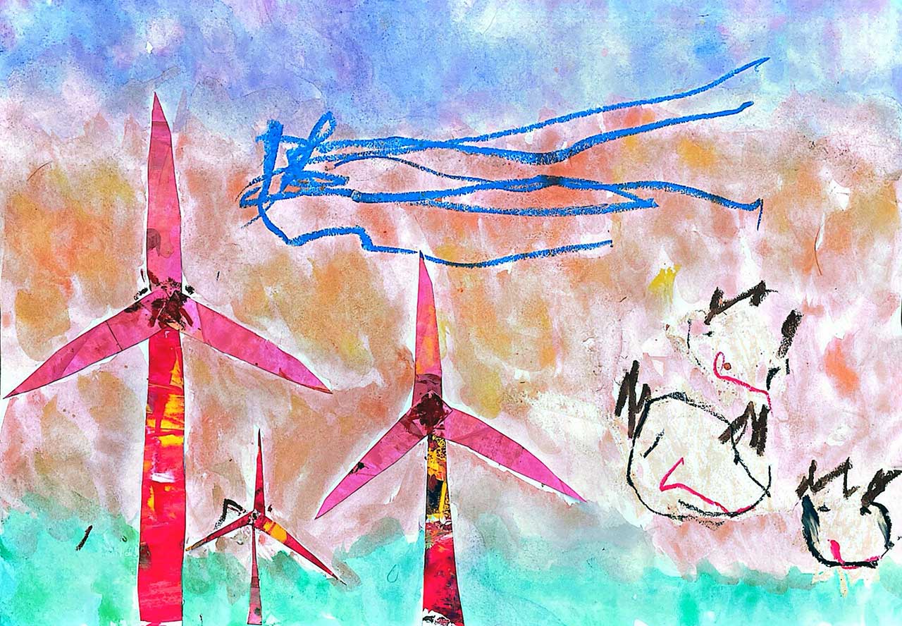 風が吹く時なら昼夜関係なく発電が出来ることも発見しこれからもっと大きい可能性が秘めていることを発見しました。風力発電で皆が笑顔になれたらいいなと家族のお顔も描いてくれました。