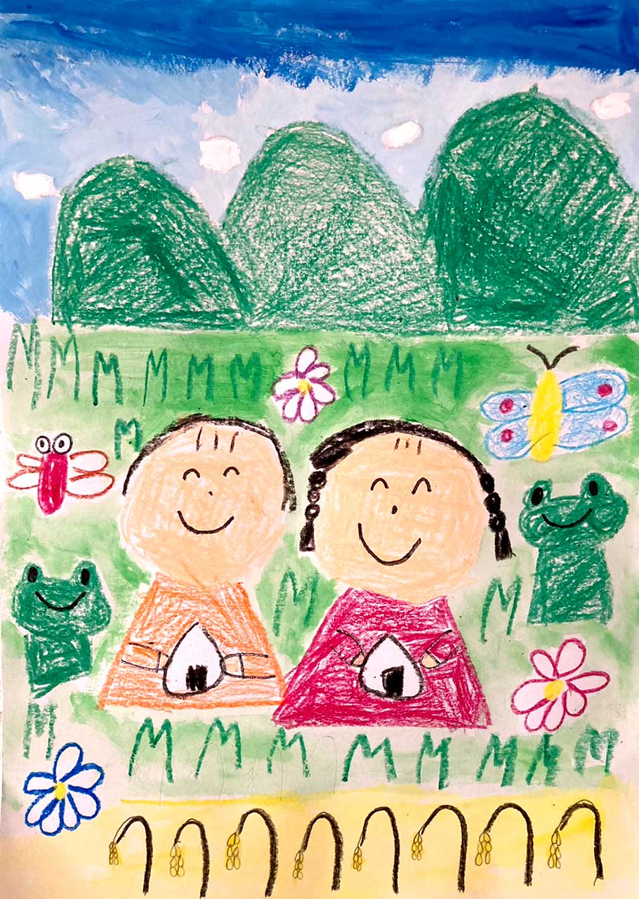 田んぼの周りで見つけた生き物と大好きな景色、美味しいお米を描きました。