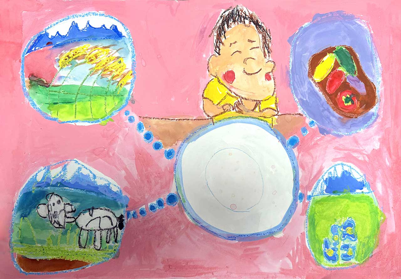 毎日の「いただきます」や「ごちそうさま」には意味があるよと教えたこの、夏。残さず食べる理由は、お米を作っている人やお野菜を作っている人、食べられちゃう動物やその動物達の餌の為の穀物や植物があるよ、というのをしっかり理解して絵を描いてくれました。