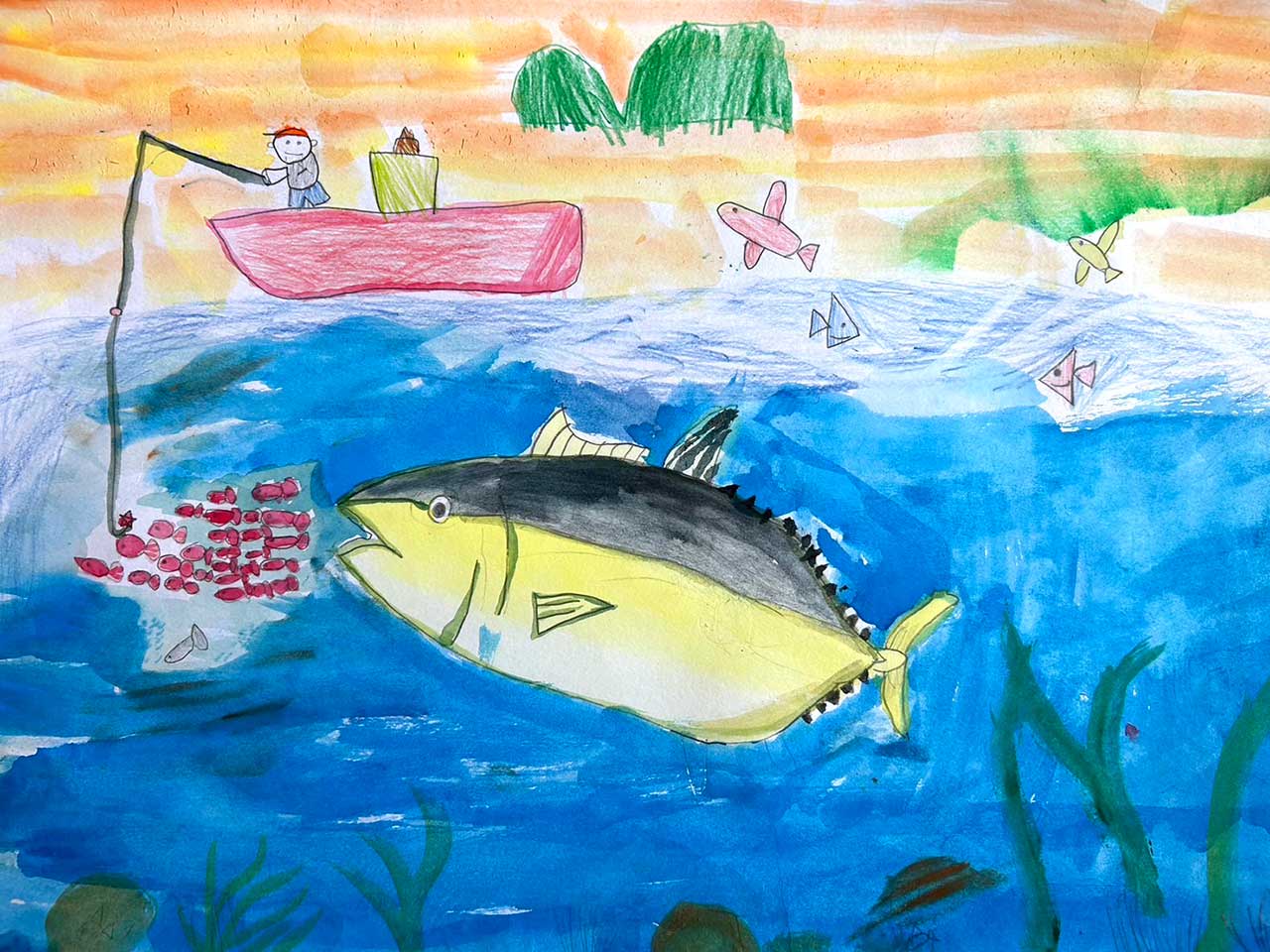 夏休みに魚つりをしました。ぼくのつった魚がマグロににていたから、この絵をかきました。いつか船にのって、この絵みたいに大きなマグロをつってみたいです。