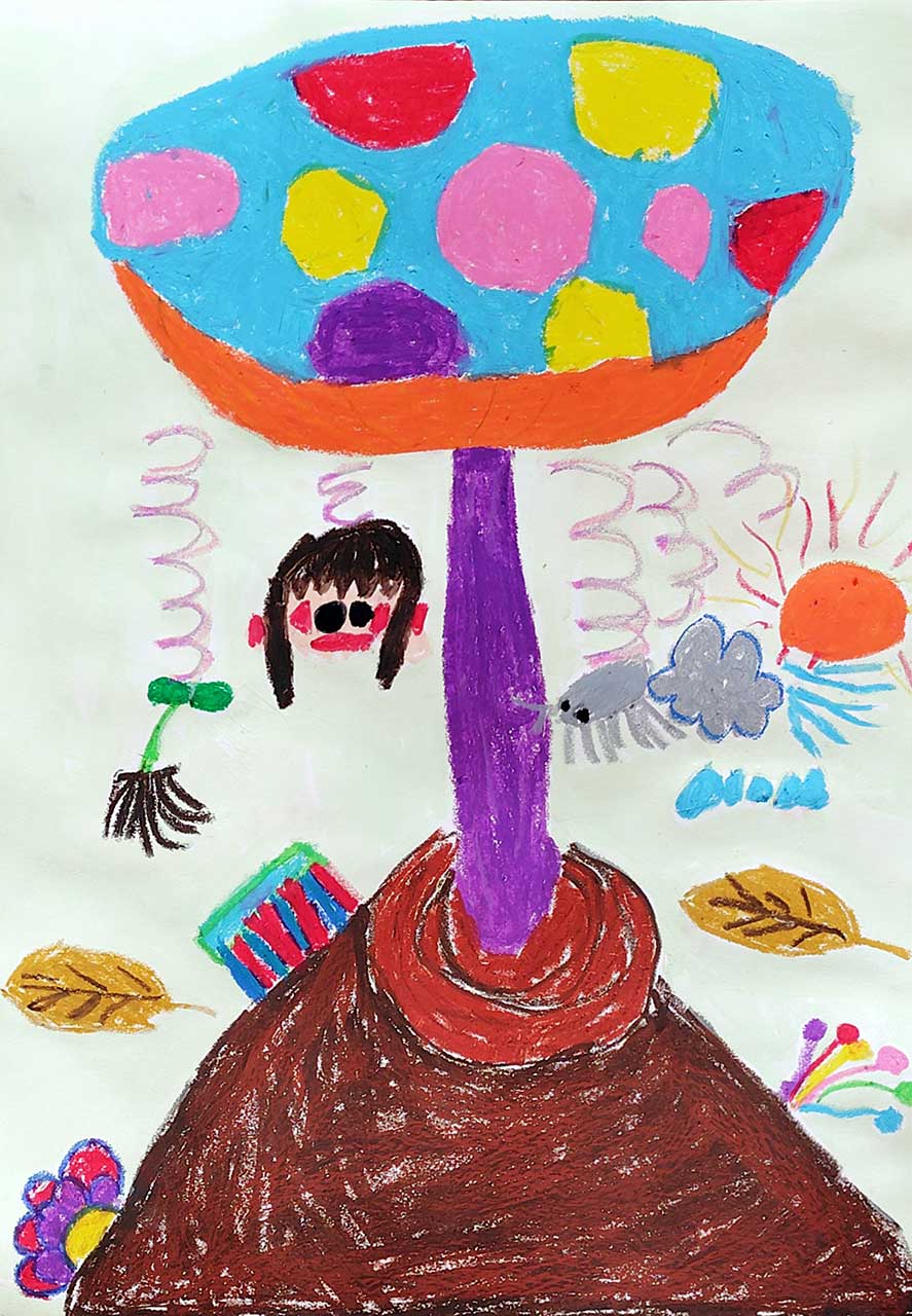 キノコが切り株や落ち葉を食べて、大きくなったキノコの胞子から太陽、雲、雨、風、虫、新しい葉っぱのエネルギーが出て、そのキノコを食べると元気になるという絵をかきました。