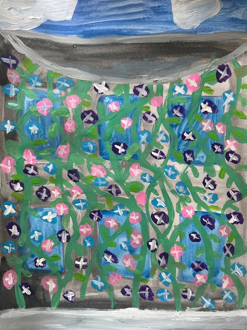 私のすんでいる町は、東京都港区高輪です。高輪には、たくさんのビルがあります。そのすべてにあさがおのカーテンをつけたら、まちがよりきれいで、温暖化をおさえることができると思い、この絵をかきました。