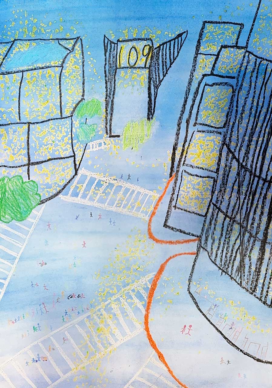 私が住んでいる東京は高い建物が多くて、いろいろなものがあって、どこに行くにもとても便利です。でもゴミがいっぱいあって、自然が少ないなと思っています。だから捨てられるプラごみを使って、お花いっぱいの街の絵を描きました。ゴミが減ってもっとお花や緑が増えたら、きれいで気持ちの良いすてきな街になると思います。私もゴミを減らして街づくりの役に立ちたいです。