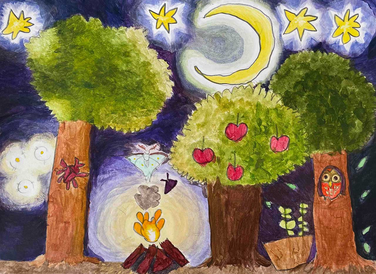 大好きなカブトムシや、昆虫をテーマに自然について描きました。樹液を競うようにして昆虫たちが上に上にと木に登っていく様子です。休日には公園や雑木林にカブトムシを探しに行きますが、昔と比べて木の老朽化などが原因でカブトムシが減っているそうです。豊かな自然が続くようにと思っています。