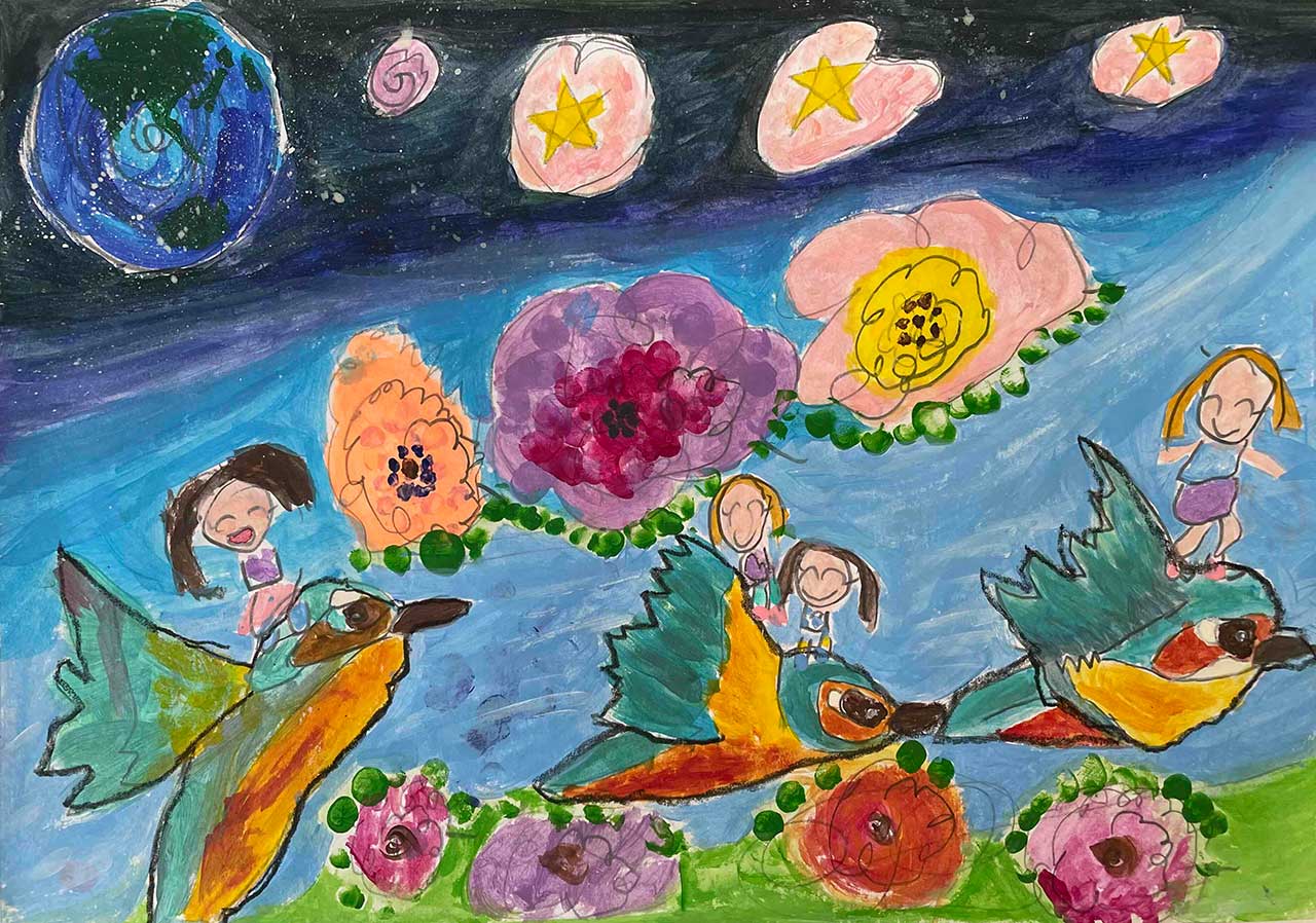 わたしのすむ街には、川沿いに時々カワセミを見ることができます。カワセミはきれいな川にしかこないとききました。わたしはお花が大好きなので、お花をたくさん咲かせてみんながニコニコと笑いながら、カワセミが沢山あつまる街になるといいなと思いました。宇宙からながめても、わたしたちが住む地球がずっと青くきれいに見えるようにと思って、地球もかきました。