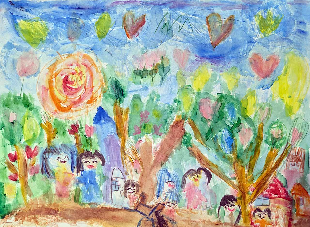 宝石で光り輝くまちって素敵ですね。描いてくれた子どもたちの笑顔もキラキラ輝いていて幸せになります。