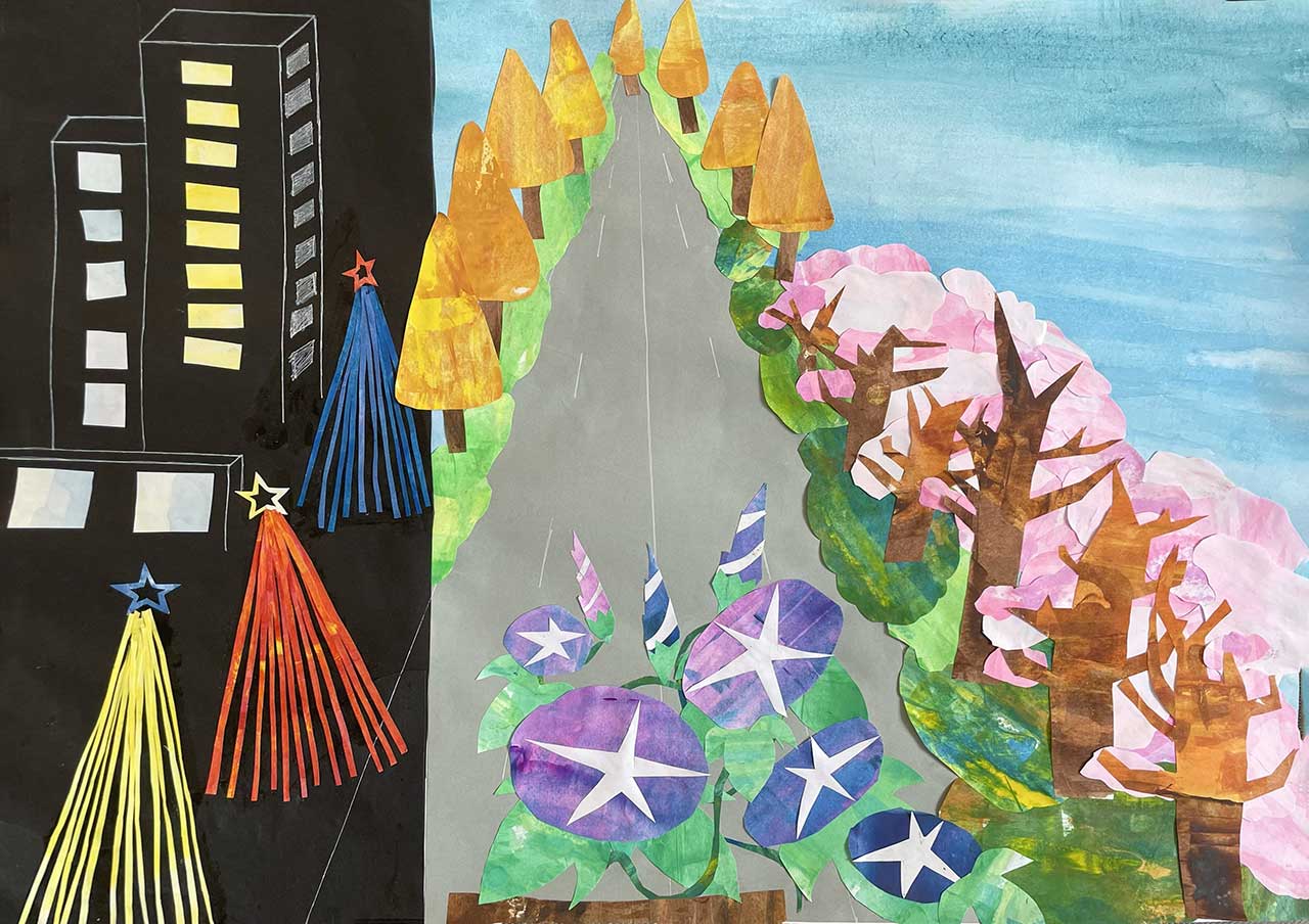 私が住む市の駅前には、大学通りと言うまっすぐでりっぱな大通りがあります。そしてこのまわりは一年中とてもきれいです。春は満開の桜、夏には朝顔市が開かれ、秋にはイチョウ、そして冬にはイルミネーション。順々に見るのもキレイだけど、全部一緒に見ることができたらきっともっときれいだろうな!と思いこの作品を作りました。イルミネーションを作るのが少し難しかったです。朝顔を作るのがとても楽しかったです。