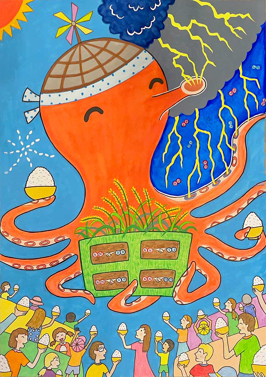 愛知県にタコの島があります。島じゅうタコだらけで料理がおいしいです。その島に行った時にアイデアがひらめきました。この絵のタコロボットは太陽光、風力、雷を食べてエネルギーにかえます。そのパワーでたくさんのあしを動かしてお米を作ります。雷の放電によって空気中の窒素と酸素が結びつき、雨にとけて土に入り、それが稲を元気にして豊作になります。日本じゅうのみんながおいしいお米をたくさん食べられるといいな。