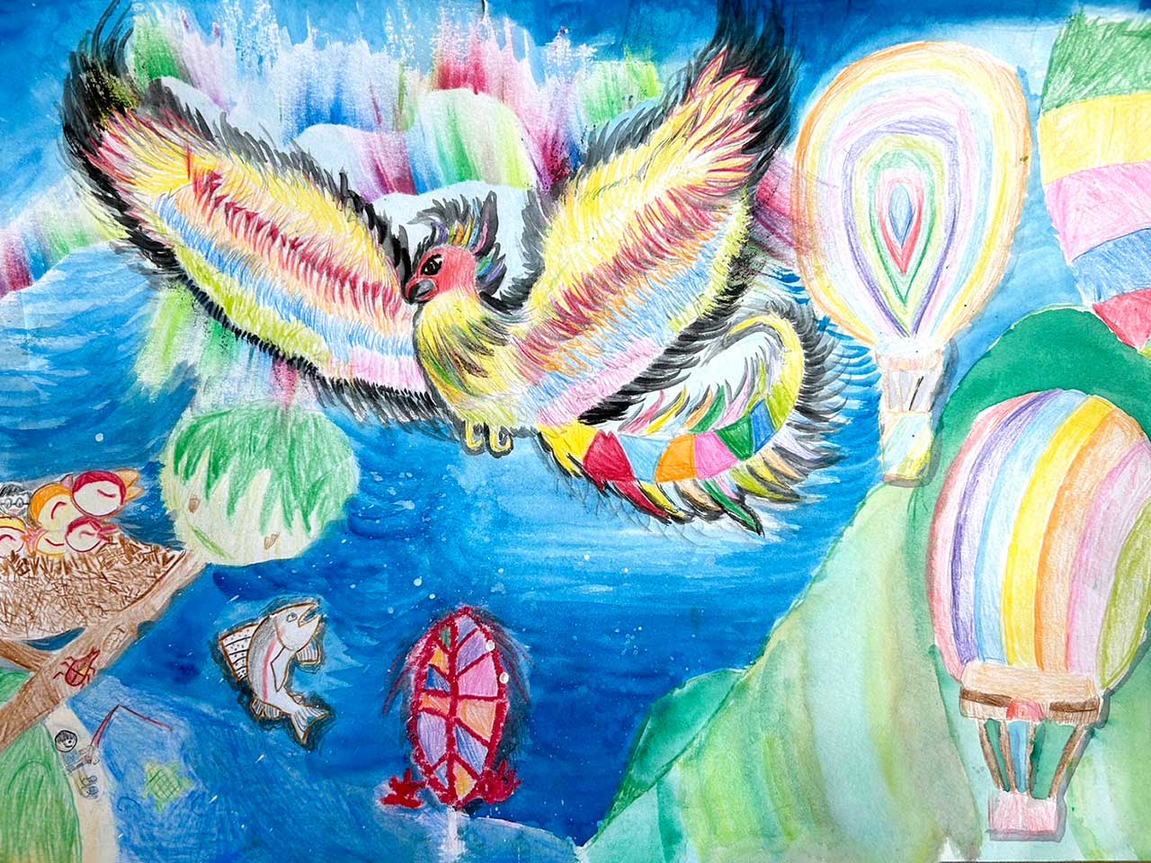 僕はこの夏に「火の鳥」を読んで、命をつなぐ鳥だと知った。火の鳥の羽ばたきは、大空を舞い上がり風を巻き起こす。その風は、僕の大好きな鳥や魚、自然を守り続けるエネルギーのもととなる。火の鳥は、命のシンボルだと思う。