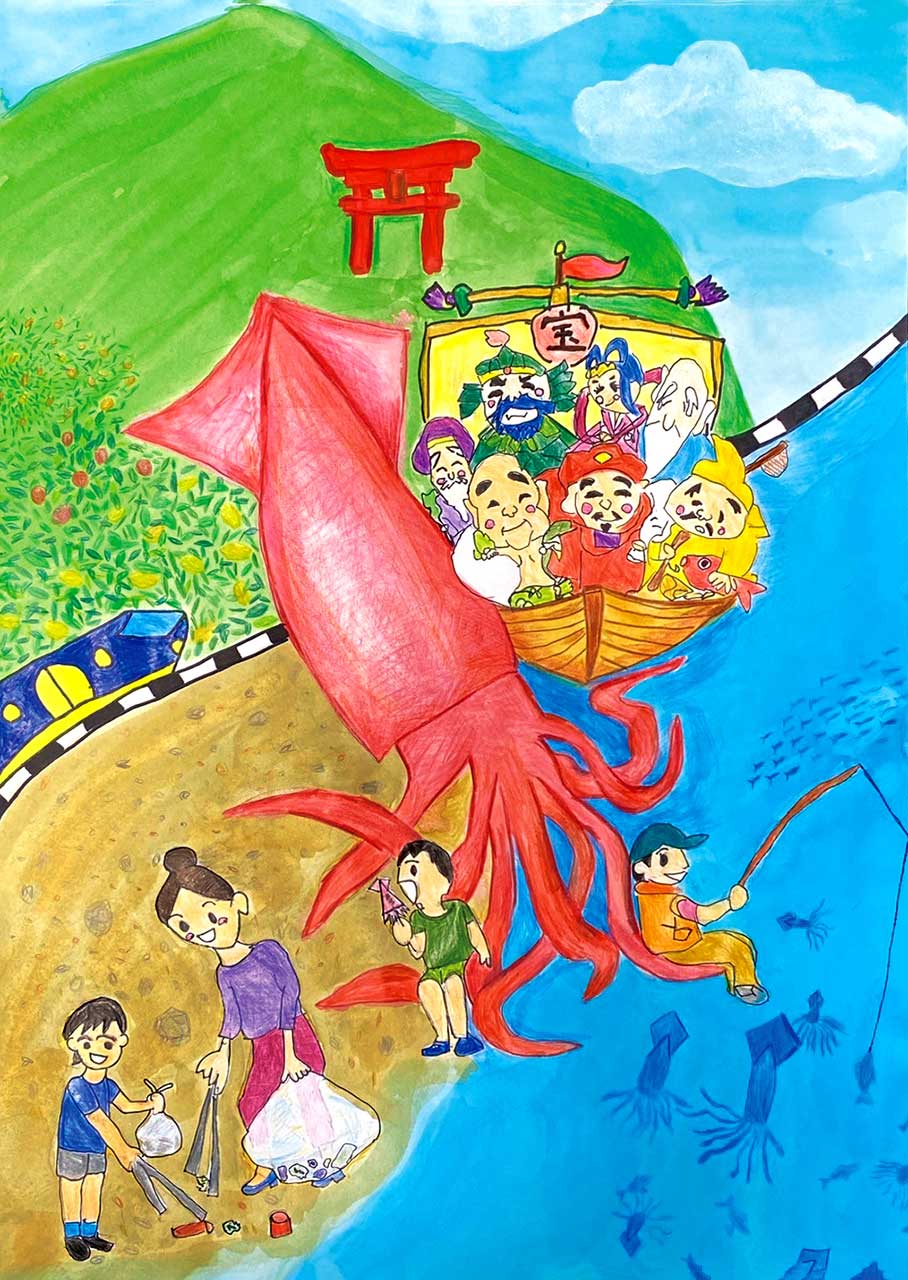 名産品がない街で名物をつくろうと、大きなイカと七福神の姿を描いてくれました。みんなで川をキレイにしているのもポイントですね。