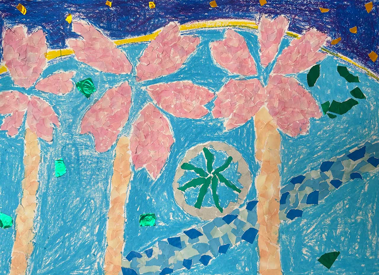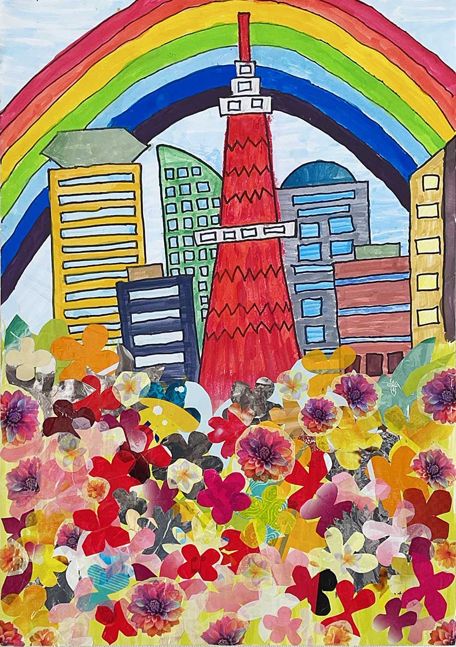 私が住んでいる東京は高い建物が多くて、いろいろなものがあって、どこに行くにもとても便利です。でもゴミがいっぱいあって、自然が少ないなと思っています。だから捨てられるプラごみを使って、お花いっぱいの街の絵を描きました。ゴミが減ってもっとお花や緑が増えたら、きれいで気持ちの良いすてきな街になると思います。私もゴミを減らして街づくりの役に立ちたいです。