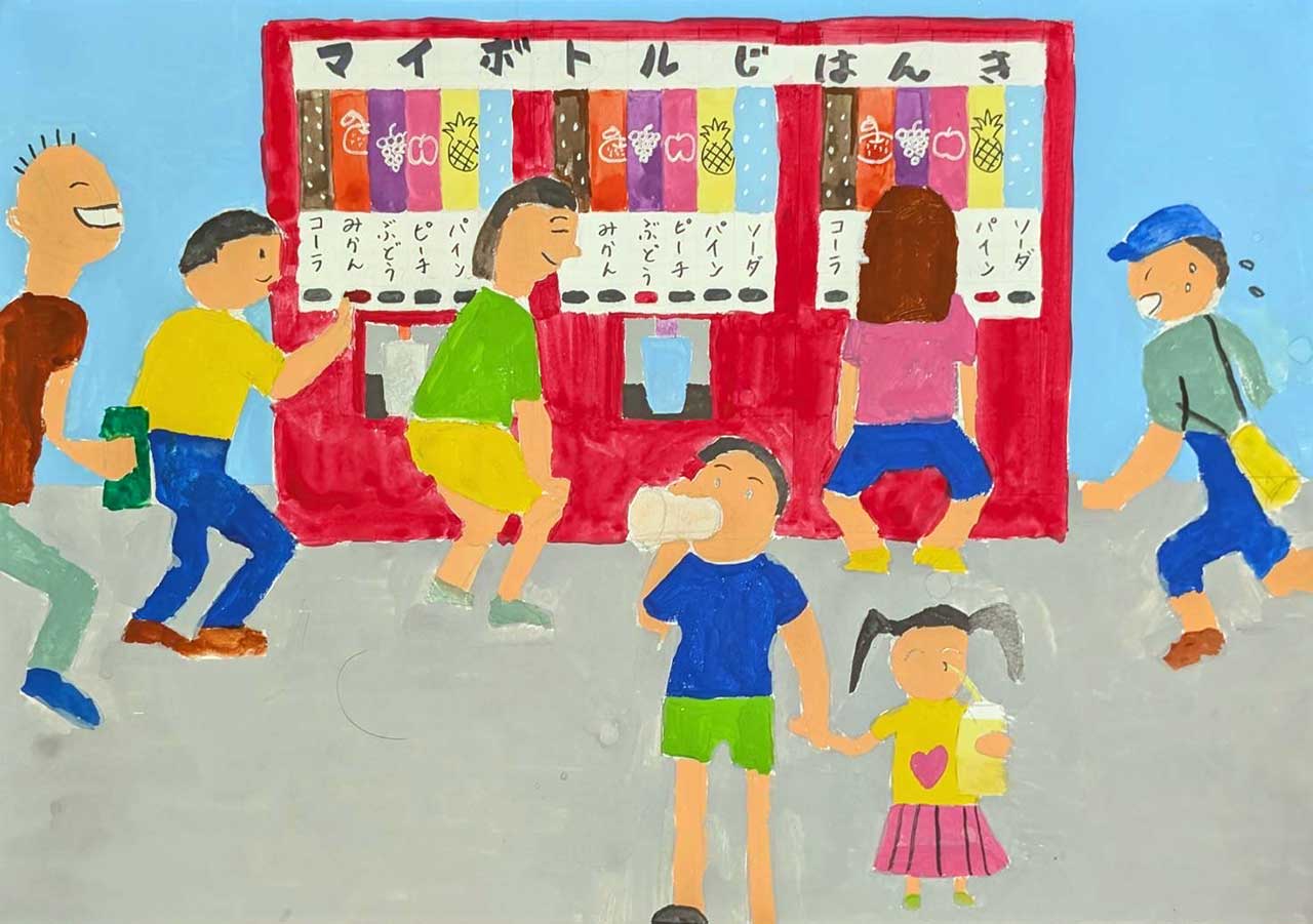 私のまちの自動販売機のまわりには、ときどきペットボトルや缶のごみが散らかっています。その様子を見て、とても残念で悲しい気持ちになりました。そこで考えたのが、自分のボトルを使える自動販売機です。みんながマイボトルをもって飲めば、ごみは減り、まちもきっときれいになります。大好きなまちを守りたい思いをこめて、この絵をかきました。