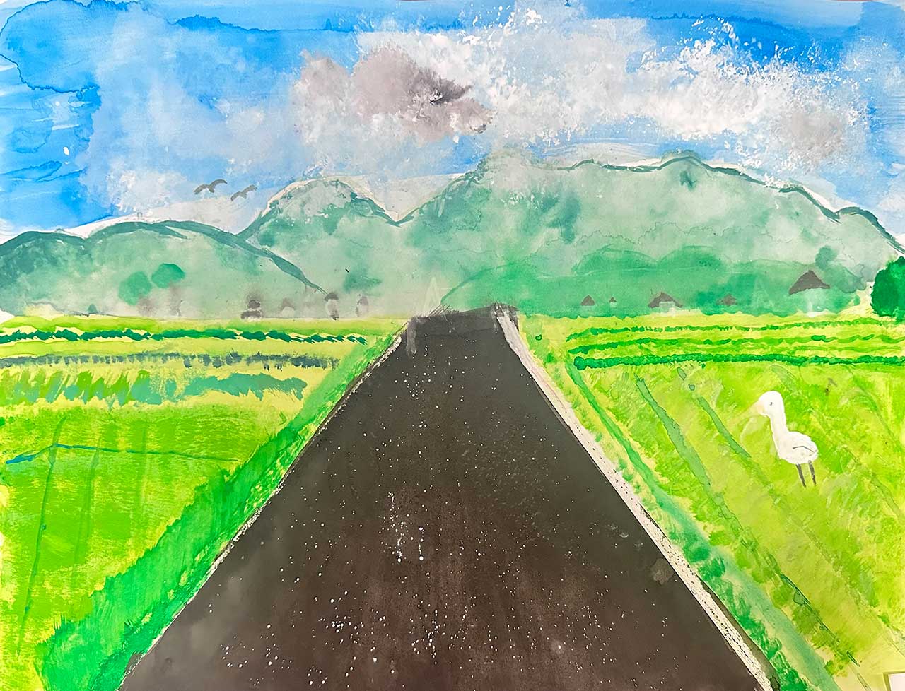 私の大好きないつも通るおばあちゃん家までの道を書きました。お母さんが子供の頃からずっと変わらない景色で、家族もおばあちゃんもおじいちゃんも皆んな大好きな景色です。これから先の未来も、この景色が変わらずあり続けて欲しい、そしてこのような場所がこれ以上減らないで欲しいと思ってこの絵を描きました。