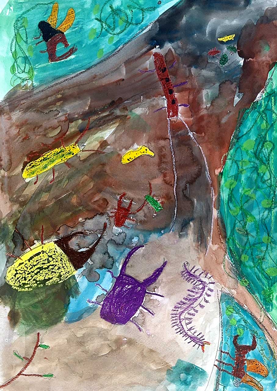 大好きなカブトムシや、昆虫をテーマに自然について描きました。樹液を競うようにして昆虫たちが上に上にと木に登っていく様子です。休日には公園や雑木林にカブトムシを探しに行きますが、昔と比べて木の老朽化などが原因でカブトムシが減っているそうです。豊かな自然が続くようにと思っています。