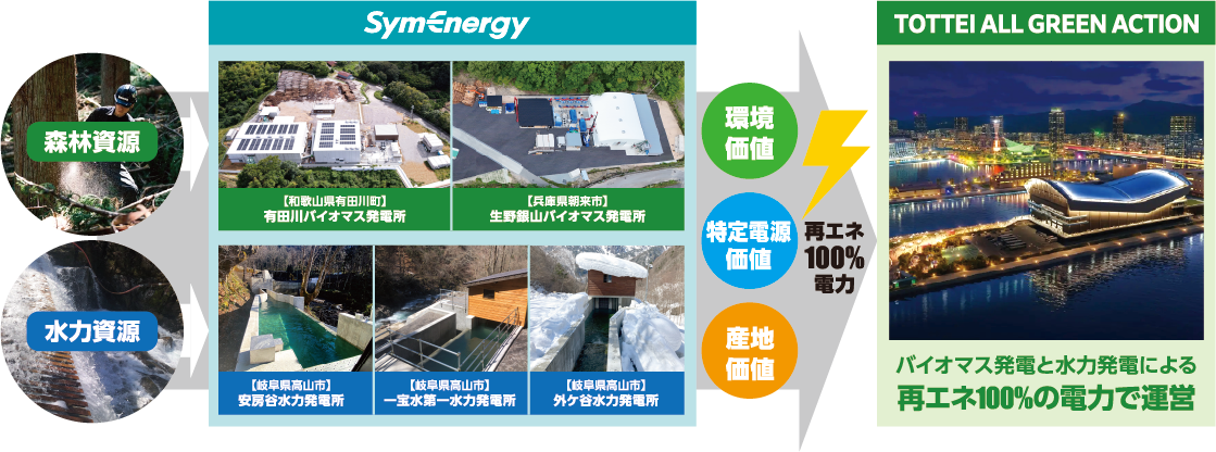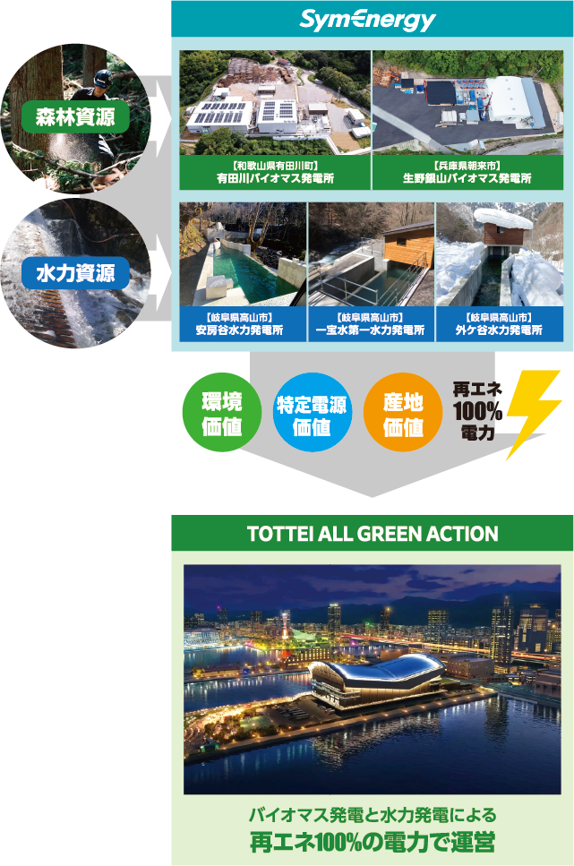 シン・エナジーは神戸ウォーターフロントから地域・社会課題解決に取り組む民間協業プロジェクト「TOTTEI ALL GREEN ACTION」に参画し、GLION ARENA KOBEおよびTOTTEI PARKに供給する電力を、当社が運営に携わる再生可能エネルギー発電所由来の電力でまかなっています。 「環境価値」「特定電源価値」「産地価値」の3つの価値を同時に提供することで実質CO2排出量ゼロを実現します。 各地域で生産された電力を同アリーナに供給することで、地域産業の活性化にも寄与してまいります。